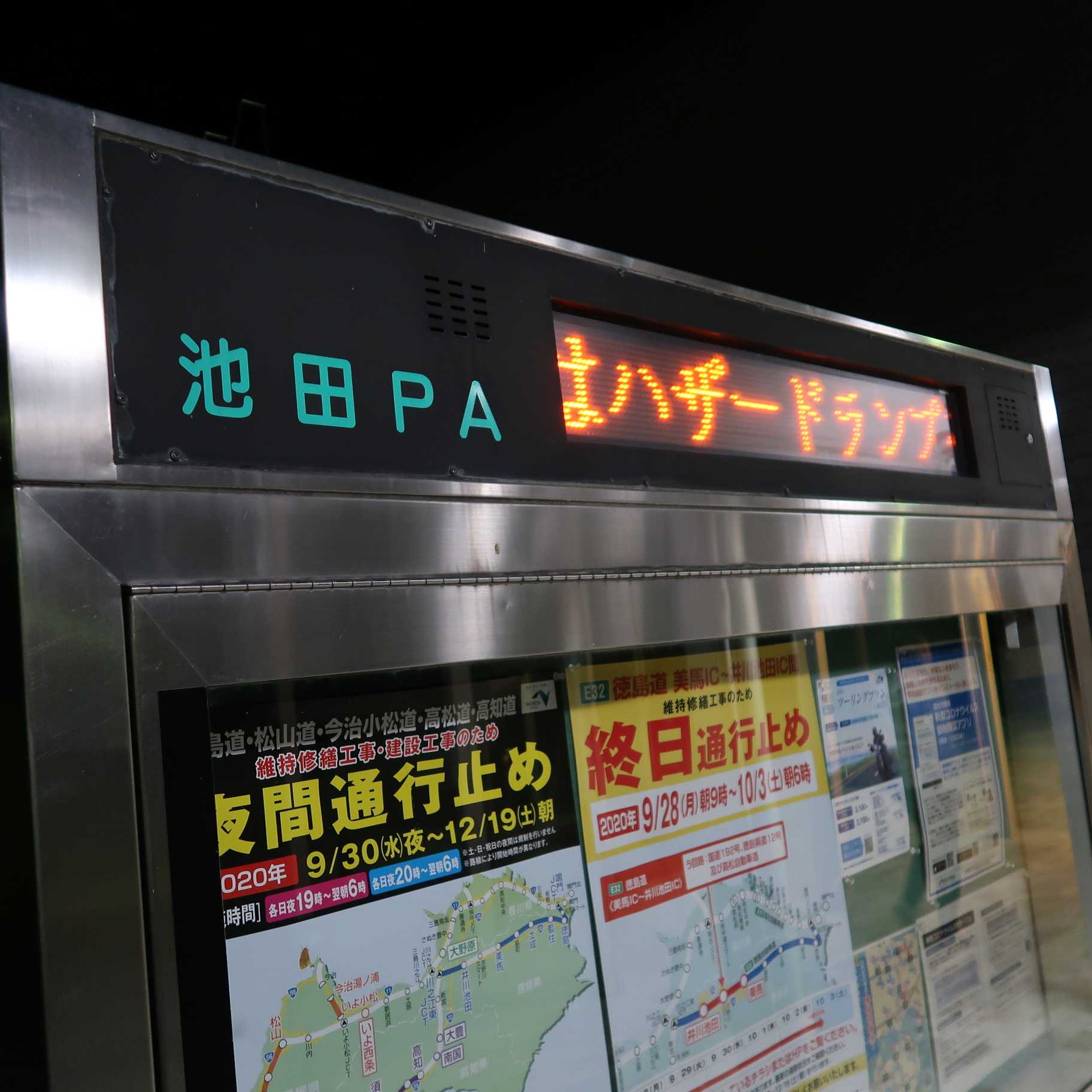(2020-09-20) トイレのみPA。現在20時30分。朝の3時30分から17時間走ってるし、さっきお風呂に入ったから身体がぽかぽかして眠い(^^; 今すぐにでも仮眠をとりたいが、四国フリーパスは今日の24時まで…とりあえず四国を脱出せねば! |