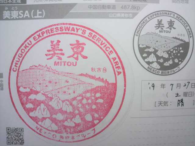 (2019-07-21) 2019年夏休み・九州旅行2日目。「佐和山SA」より山陽道~山口JCT~中国自動車道に入り、当SAに立ち寄りスタンプ押印(^^)。 |